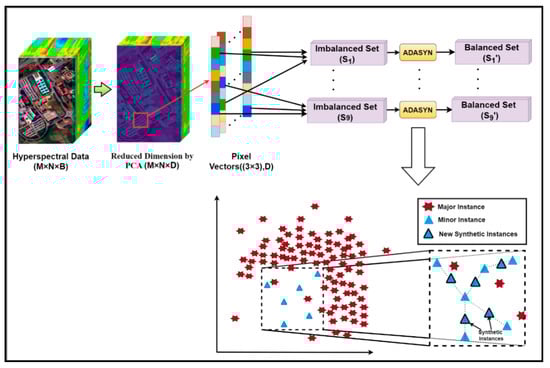 Suppose the original HSI dataset was of dimensions M × N × B, where M and N denote the length and width of the 3D hypercube and B represents the number of spectral bands. Each band consisted of a total of (M × N) pixels. PCA was employed to reduce the influence of redundant information for dimensionality reduction on the entire original image containing labeled and unlabeled pixels, as illustrated in Figure 5. The new size of the dimension-reduced HSI dataset was M × N × D, where D represents the number of principal components and D < B. The most significant spectral features of the entire HSI dataset lie with D bands. Next, we reshaped each of the D numbers of bands into a 1D data structure containing spatial characteristics represented by the (M × N) number of pixels. Every imbalanced 1D band is oversampled using ADASYN, as diagrammatically shown in Figure 5. In order to achieve the spatial–spectral information of the dimension-reduced dataset, a sliding window of size 3 × 3 × D with stride step 1 was run all over the dataset. Thus, the total number of instances/pixel vectors obtained was K = (M − 2) × (N − 2), with eight neighboring pixels for each central sample of the window, as shown in Figure 5. Since each sample is generally similar to its spatial neighbors due to the spatial similarity, possessing the same class label. Thus, we obtained the imbalanced dataset with subsets as S = {S1,···,S9} by collecting and extracting the pixels from the corresponding locations from every patch. Next, ADASYN oversampled each imbalance dataset based on the proportion of majority class occurrences to minority class instances based on the red ‘*’s as major samples and blue triangles as minor samples, respectively (Figure 5), denoted as S’ = {S’1,···,S’9}.