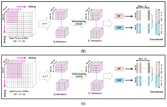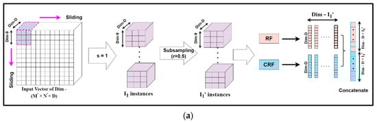 Mg-sc is a crucial feature of DgcForest that helps improve the representational learning ability when inputs have a lot of dimensionalities, making it ideal for HSI classification. A sliding window was used to scan raw features in order to build numerous feature vectors in Mg-sc. Then, a CRF and an RF were used to train the instances corresponding to these feature vectors. After that, the class vectors were created, and transformed features were concatenated. The data that the sliding window traverses every time were selected as a sample in Mg-sc. From the original input, the sliding operation can learn the feature vector of the input information. Then, we used the class probability vectors output by the two RFs as the features of the new sample, and input them into two RFs, one general and the other a CRF. The subsampled Mg-sc was elaborately described with the help of Figure 6 and the following mathematical expressions [].