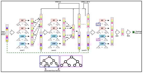 CF works on a level-by-level basis, similar to how DNNs work on a layer-by-layer basis. Each level of a CF receives the feature information from the previous level’s processing and sends the feature information to the next level. Each level contains two types of forests: RFs and CRFs, each having an F-number of forests, to encourage the diversity needed for ensemble formation. F is a hyperparameter that can be specified in various ways depending on the situation. There are Ft trees in both CRF and RF. Each tree leaf node develops until it includes just the same class of instances or no more than ten examples. The method uses Mg-sc to build its matching altered feature representation before going through a multi-level cascade to generate high abstract feature vectors. It outputs the instance’s class distribution to the next level at each level of a CF. The DTs are categorized by the leaf node into which the input instance falls, forming a CF’s foundation. The leaf node may contain training samples from the same or separate classes. The proportion of the total number of samples of the leaf node that each category includes is computed for the leaf node into which the instance falls and then takes the average of all decision-making leaf nodes in the same forest. The output of the forest in each level cascade is a class vector used by the forest in each level cascade to process information, for instance. The outcomes of all forests in each level’s class vectors are concatenated, and the output to the next level is mixed with the original input vector.