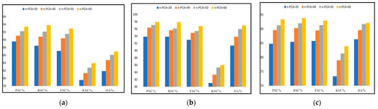 In order to establish that our proposed PCA-ADASYN-based ADA-Es-gcForest was more advantageous, we completed the following steps: (1) We took 20, 40, 50, and 60 global spectral features selected by PCA to evaluate each model’s performance. (2) We included the eminent oversampling methods and applied them to remove the imbalance in the HSI datasets. Thus, we considered SMOTE to compare with the results obtained by ADASYN. (3) Six tree-based standard ensemble classifiers were chosen, i.e., RF, RoF, bagging, AdaBoost, XGBoost, and DgcForest. These comparison algorithms are being novelly used for HS datasets. (4) We tested on the same preprocessing environment with our proposed model to produce a comparative statistical analysis of classification performance (different ensemble tree-based classifiers obtained the accuracy). (5) We obtained the classification maps of all three datasets taken in our experiments for better comprehensibility. (6) We made a training time comparison between the TECs and our model to depict their time complexities.