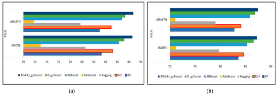 The TECs—RF, RoF, bagging, AdaBoost, XGBoost, DgcForest—and our proposed were also tested for their time complexities in terms of the total time elapsed (TTE). TTE was defined as the total time of execution, i.e., the difference between the start time and the end time of the program code in the machine, which included testing with different train–test ratios. Table 17, Table 18 and Table 19 depict the tabular depiction of the various classifiers used in our work. These classifiers were assisted by n-PCA = 60 and ADASYN as the oversampling technique. The outlook of all three tables made us reach the inference that AdaBoost acquired the lowest TTE, whereas RoF required the highest. In addition, the highest in dimension, the PU dataset obtained the end result in the largest amount of TTE. Our proposed model ADA-Es-gcForest took a fair amount of time to execute, but its TTE was remarkably lower than the DgcForest. Thus, the larger the training set volume, the higher the TTE for all datasets.