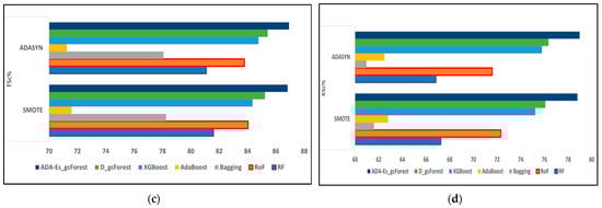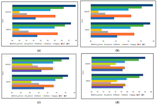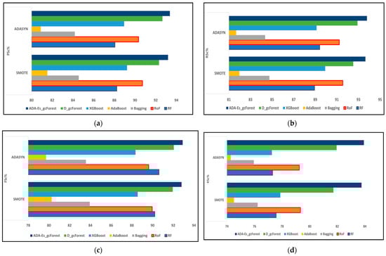 The comparison of assessment metrics between the classifier models RF, RoF, bagging, AdaBoost, XGBoost, DgcForest, and our proposed model ADA-Es-gcForest for 40% SV test sets: (a) PSc%, (b) RSc%, (c) FSc%, and (d) KSc%.