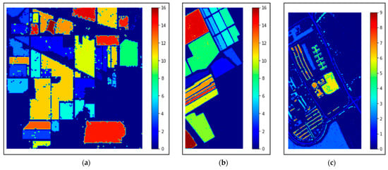 The classification maps obtained by our proposed model ADA-Es-gcForest for the HSI datasets: (a) IP, (b) SV, and (c) PU.