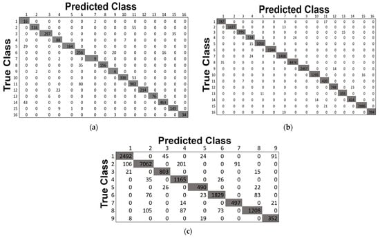 This study also includes the classification maps for the three datasets represented in Figure 12. The classification maps provided better visual comprehensibility to the readers/researchers about the classification accuracy, i.e., our proposed model’s correct prediction of each category in the HS scene. In addition, to those maps, the confusion matrices for the three 40% testing datasets obtained by our proposed method are depicted in Figure 13. The matrices provided better comprehensibility for OA% achieved by ADA-Es-gcForest and the classified sample scenario for each major and minor class for all the datasets. For example, Figure 13a shows that classes 9, 7, 1, and 16 were the classes of the IP dataset with fewer instances, but they remarkably obtained the ‘true positive’ values. On the other hand, the most major class instances, such as 11, 2, 14, etc., were also placed in the correct place in the matrix. The same scenario can be observed for the SV and PU datasets in Figure 13b,c, respectively.