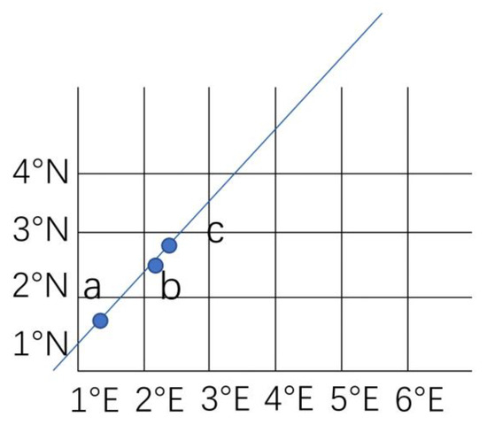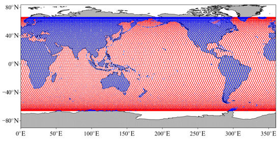In this paper, due to the respective limitations of satellite technology, geography, and environment, only the changes within 66° north-south latitude and 180° east-west longitude are discussed in the calculation of sea level changes using satellite radar altimeter observations. While calculating the sea surface anomaly, the along track altimetry data are directly used without interpolation. The basic idea is to first divide the Earth’s surface between 66° north and south latitude and 180° east and west longitude into a 1 × 1° grid, as shown in Figure 1. When the ground tracks of satellites are in a 1° × 1° grid, calculate the average value of sea surface height anomaly of satellite observations in this grid. Figure 2 shows the ground tracks of satellites of Jason-1. Finally, the monthly, quarterly, or annual mean product of sea level anomalies for the study area is obtained by averaging the values over the desired time range. Since the regular lat/lon grids are used, the grid spacing (or area) changes with latitude. Thus, a weighted average to derive the global mean is necessary. The regional weighted averaging method used in this study is as follows: