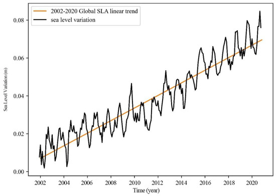 Next, the rise rate of global sea level change from 2002 to 2020 was obtained as 3.3 mm/a, as shown in Figure 4. This result is slightly different from previous research results [34,35,36,37]. At the same time, it is also slightly lower than the global sea level rise rate [38] announced by many international institutions, such as CU, AVISO, CSIRO, and NASA GSFC. One explanation for this is that the linear model used in the paper ignores the effect of interdecadal variability.