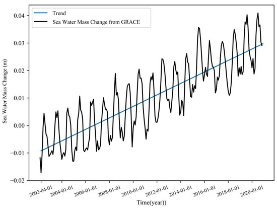 The RL06M data were processed using the above method to obtain a monthly averaged time series plot of seawater mass change, as shown in Figure 5. The same linear regression least squares method was then selected to calculate the long-term trend of sea level change due to seawater mass from 2002 to 2020, which is 2.07 mm/a, as shown in Figure 5. Next, the rate of increase was calculated for the same period of ten years before and after the sea level change trend due to seawater mass from 2002 to 2012 is 1.9 mm/a, accounting for 79.1% of the overall sea level rise rate in the same time period. This result is similar to the sea level change trend due to seawater mass from January 2004 to December 2010 calculated by Li [42], which is 1.84 mm/a, accounting for 73% of the total sea level rise rate. The sea level change trend due to seawater mass from 2010 to 2020 is 2.3 mm/a, accounting for 56.09% of the overall sea level rise rate in the same time period, which is a relatively small percentage. The main consideration is that, from 2011 onward, there are numerous missing months, and part of the data was obtained by interpolation, thus the data may deviate from the actual situation. Overall, however, sea level change due to seawater mass from 2002 to 2020 accounts for 67.8% of the overall upward trend.
