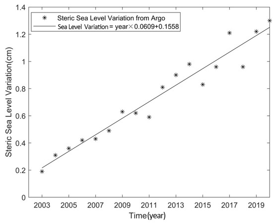 The linear model is fitted to obtain a long-term trend of 0.6 mm/a in sea level change due to seawater temperature and salinity change from 2003 to 2020, as shown in Figure 6. Once again, the rate of rise was calculated for the preceding and following decadal time periods, yielding a steric sea level trend of 0.58 mm/a for the period of 2003–2012, accounting for 24.16% of the overall rate of sea level rise over the same time period; and a steric sea level trend of 0.61 mm/a for 2010–2020, accounting for 14.8% of the overall rate of sea level rise over the same time period, which is a relatively small percentage. The main reason for this is the bias in the Argo salinity data from 2016 onward, with some of the interpolated results possibly deviating from the actual results. Overall, the change in steric sea level from 2002 to 2020 accounts for 19.6% of the overall rising.