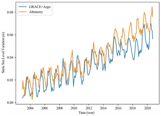 Global sea level changes can be attributed to the sea water mass changes and steric sea level change [27,28]. The steric sea level change is mainly a result of the expansion and contraction of seawater volume caused by the temperature and salt changes of seawater, which can be estimated from the measurement data. Meanwhile, the mass sea level change is mainly caused by the melting of land glaciers and ice sheets, which can be calculated from the GRACE gravity satellite data. The relationship can usually be expressed by the following [10,29]: