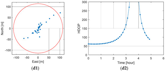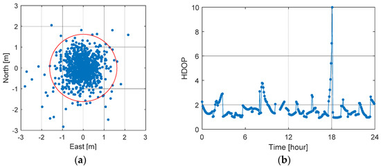 where indicates the th entry on the diagonal of , and , , and are the standard deviation of the east, north, and up (vertical) components of the position error, respectively. Equation (17) shows that the distribution of the position error depends entirely on the variance of the range error and the satellite geometry. The so-called horizontal dilution of precision (HDOP) is then given by: