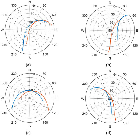Figure 3 shows the sky plots of the GPS satellite pairs that provide similar phase angles to those of the lunar MDPO simulation. Each satellite of the pair has to be chosen from a different orbit plane since the separation angles of the GPS satellites in the same orbit plane are too wide to emulate the lunar MDPO constellation as shown in Table 3. The observation period was set to 450 s to achieve a similar angular travel value of 3 degrees. The observation period is much larger than that in the lunar MDPO simulation because the typical orbital period of GNSS satellites is about 24 h, whereas the simulated low-altitude lunar satellite completes one orbit every 2.4 h.