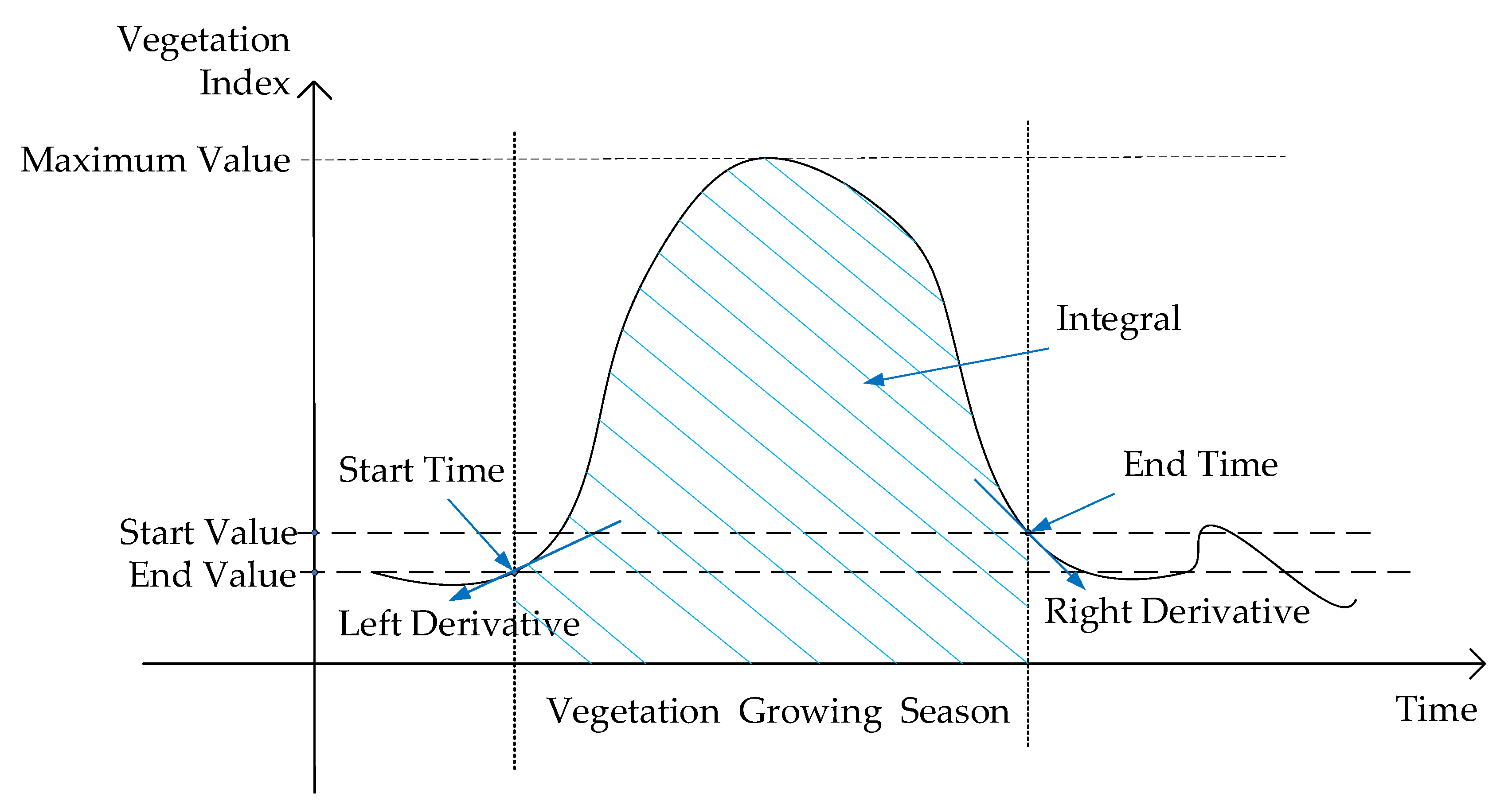 - Zeng, L.; Wardlow, B.D.; Xiang, D.; Hu, S.; Li, D. A review of vegetation phenological metrics extraction using time-series, multispectral satellitedata. Remote Sens. Environ. 2020, 237, 111511. [Google Scholar]
