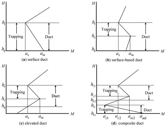 Schematic diagram of lower atmospheric duct types and parameters: (a) surface duct; (b) surface-based duct; (c) elevated duct; (d) composite duct.