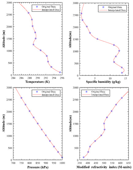 - Interpolate the temperature, pressure, specific humidity, and geopotential profiles to a 20 m resolution in the vertical by cubic-spline interpolation [29]. It should be noted that the altitude can be obtained by the geopotential of each pressure level. The altitude can be calculated by the following formula:where G is the geopotential (m2/s2) and g is the gravitational acceleration (m2/s2). Here, g is a constant (9.80665 m/s2). The modified refractivity M profiles were calculated by Formulas (1)–(3). An interpolation result is shown in Figure 2.
