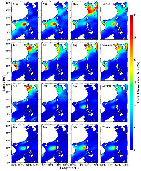 October and November are the periods when the summer monsoon changes to the winter monsoon; the Mongolian High controls and affects the offshore seas of China, making the sea surface isobar lines show a northeast–southwest trend, and the wind direction is stable and northward [30]. During this time, the seas become gradually controlled by the high pressure caused by continental cold. The atmospheric humidity is relatively lower, which is not conducive to duct formation. Through the effects of the winter monsoon, the duct occurrence rate was less than 10% between October and next March in the Bohai Sea, the Yellow Sea, and the East China Sea (Figure 3). At about the same time, the duct occurrence rate northwest of the Philippines was higher than that in summer, which may be related to frequent tropical cyclone activity. According to Chen [30], the areas from Luzon Island in the Philippines to Hainan Island at 15–20°N have the most frequent tropical cyclone activity. Ziemba [6] and Ding [33] both indicated that ducts occur frequently in areas affected by tropical storms and hurricanes.