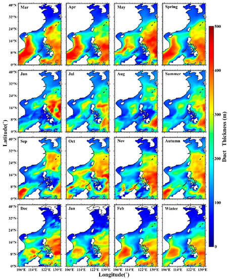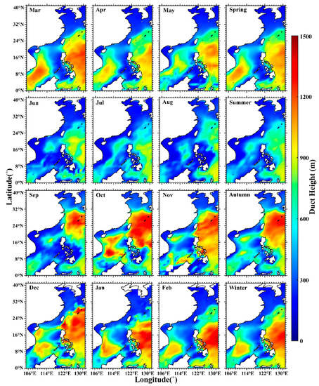 Figure 9 shows the monthly and seasonal variations in duct thickness. The duct thickness in most continental coastal areas was less than 150 m, which was lower than that over the open sea. The areas where the thickest duct events occurred aligned with the areas where the most duct events occurred. The thickest ducts were mainly concentrated in the Pacific Ocean on the east side of the East China Sea, the Philippines, and Taiwan, and in the South China Sea. Meanwhile, these areas were also where the duct thickness changed most significantly. The variations in duct thickness between spring and summer were the most prominent in the southwest of the South China Sea. In spring, the duct thickness was more than 400 m, whereas it decreased sharply in summer. The Pacific Ocean on the east side of the East China Sea, the Philippines, and Taiwan was another area where strong variations in duct thickness occurred. In autumn, the areas with a duct thickness greater than 300 m in the Pacific Ocean had a trend of moving north and west, whereas they appeared in the sea south of 20°N in winter.