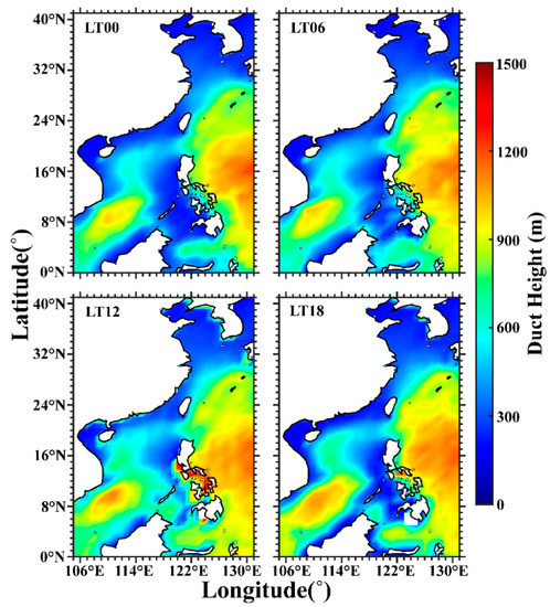 In order to study the daily variations in the ducts’ occurrence, we grouped the ducting events according to the local time (LT00, LT06, LT12, and LT18). The statistical results are shown in Figure 6. In general, the ducts appeared in fixed locations, mainly concentrated in the coastal areas of Mainland China and the northwest of the Philippines. The diurnal variations in the duct occurrence rate were more obvious in the Bohai–Yellow Sea area, the western seas of the Philippines, and the eastern coastal areas of the Indo-China Peninsula. The duct occurrence rate and the ducts’ coverage areas were greater in the evening than during the day. If we take the eastern coastal seas of the Indo-China Peninsula as an example, at LT12, the duct occurrence rate was less than 18%, with a small coverage area. At LT18, the duct occurrence rate increased by 6% and the duct areas covered most of the eastern coastal waters in the Indo-China Peninsula. However, at LT00, sea–land breezes were formed by radiation cooling, and the land breeze brought dry and cold air to the sea surface, forming an inversion layer [13,34], which helped to generate ducts.