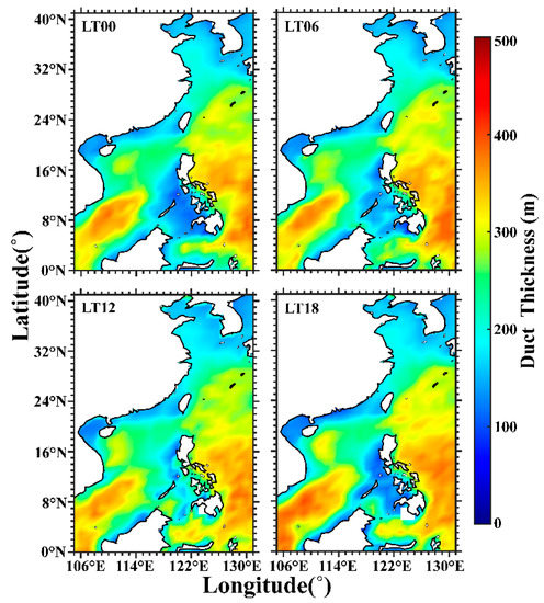 The distribution of duct thickness across local time variations can be clearly seen in Figure 10. Compared with the distribution of duct altitude, we found that the seas with higher duct altitudes usually have greater duct thickness. The diurnal variation in duct thickness was not obvious, except in minor areas, such as the southwest of the Philippines and the South China Sea. The duct thickness and the coverage range of ducts were larger at LT12 than at other times to the southwest of the Philippines. Furthermore, thicker ducting events occurred in the southwest of the South China Sea at LT18.