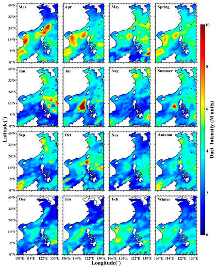 It can be observed that duct intensity was lower than 10 M-units in the marine areas adjacent to China. In spring, duct intensity was higher than in other seasons. In May, the areas with a duct intensity greater than 4 M-units began to move northward. During this time, the duct intensity began to increase in the Yellow Sea and Bohai Sea. In summer and autumn, the duct intensity was generally weaker than that in spring. The duct intensity over the seas near the Philippines increased significantly in June and July. In winter, the areas with a duct intensity greater than 4 M-units shifted southward and were mainly concentrated in the seas south of 24°N.