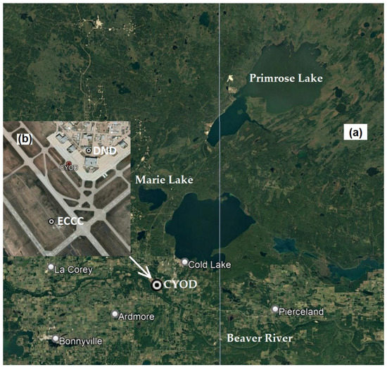 The study site is located at Cold Lake airport (CYOD) situated in northeastern Alberta, Canada (54.4073°N, 110.2783°W, 541 m ASL) and has a humid continental climate. Climatological data indicate that CYOD, Alberta, is affected by various fog conditions. The Google map in Figure 1a shows the location of CYOD and its surrounding areas. The two lakes (Cold Lake and Primrose Lake) are located in the northeast and Beaver Valley is in the south. Easterly winds bring moisture from the lakes to the airport; furthermore, a large oil refinery that is north-northwest of the airport is a source of a large quantity of anthropogenic aerosols and heated water vapor that may contribute to the formation of fog.