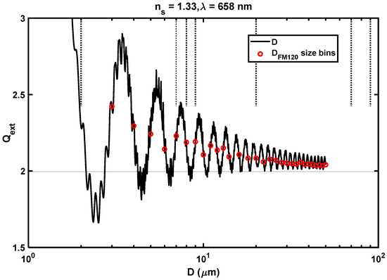 Extinction efficiency calculated using Mie scattering theory. The red circles show the measured particle size bines for FM-120 probe.