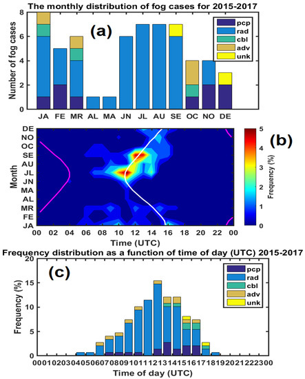 Fog temporal distribution: (a) monthly distribution; (b) the frequency of fog occurrence versus month and time of day (UTC), with the white line indicating sunrise time and the pink line sunset time; (c) the frequency distribution as a function of time of day.