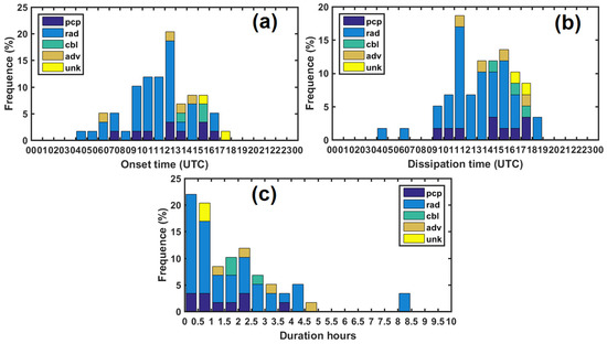 Figure 5 shows the distributions of fog events onset (Figure 5a), dissipation time (Figure 3b), and duration (Figure 3c) for different fog types. Radiation fog could last from several minutes to more than 8 h (Figure 5c). Based on this study, the mean fog duration for all fog types was 1.9 h, and the mean duration for radiation fog alone was 2 h, for precipitation fog 1.5 h, advection fog 2.7 h, cloud-base-lowering fog 2 h, while the unknown fog type only lasted for 0.6 h.