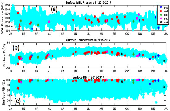The time series of surface pressure (a), temperature (b) and relative humidity (c) measured at 2 m height in 2015–2017. The types of fog that occurred are also indicated.
