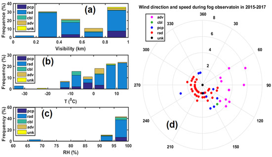 Figure 7 shows the frequency distribution of the observed visibility (Figure 7a), surface level temperature (Figure 7b) and relative humidity (Figure 7c), and the wind speed and direction (Figure 7d). The data in Figure 7a demonstrate that 94% of the low visibility (<0.4 km) cases were caused by radiation fog and the remainder, 6%, were caused by precipitation, advection, and cloud-base-lowering fogs. The distribution of surface wind speed and direction measured at about 2 m height (Figure 7d) shows that the wind speeds were greater than 2.5 during the cloud-base-lowering and advection fog events, and the corresponding wind directions were mainly coming from the southeast and east. Most of the radiation fogs occurred under calm wind conditions (<2 ), with the predominant wind coming from northwest, west, southwest, and south directions.