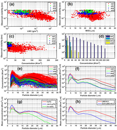 The relationship between the one-minute visibility measured using the PWD22 against the one-minute averaged LWC (a), MVD (b) and concentration Nd (c) using the FM-120 probe; The histogram of one-minute averaged concentration for different fog types (d); The one-minute averaged fog particle spectra for different fog types (e); The mean fog particle spectra of the period from January to September 2017 for different fog types (f), temperatures (g), and different LWC (h).
