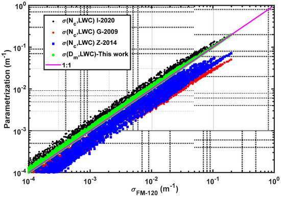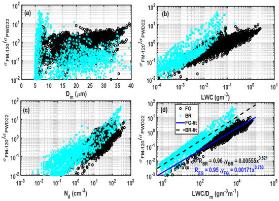 where the and the density of water are given in gm−3 and the area weighed diameter is given in m. The extinction is given in m−1. In order to investigate the dependence of on , , , and , scatterplots for each case are given in Figure 9 and the associated best-fit regression lines and the correlation coefficients are also given. Based on these results, although the correlation coefficients were close, the error variance (EV), or the square of root mean square error (RMSE), were higher when only was used (Figure 9b), by a factor of three compared to when LWC was used (Figure 9a), and by more than a factor of 10 when both Nd and LWC were used (Figure 9c). Figure 9d shows derived in this study; as indicated in the plot, there is excellent agreement with the FM-120 observation with R close to 1 and a mean square error (MES) of near zero.