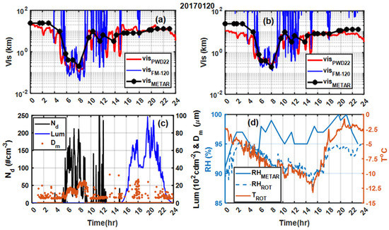 The FM-120 probe estimated higher extinction when both and were relatively high (Figure 13c). Similar plots for a wintertime case on 20 January 2017 are shown in Figure 14. In this case, the fog event also occurred during the night (Figure 14c). The PWD22 also agreed better with human observation (Figure 14b), but, because of cold temperatures (−12 °C < T < −5 °C), it was a freezing fog event, potentially due to radiative cooling during the night. The RH sensors gave conflicting results; however, based on the one reported by the human observer (METAR), the RH values exceeded 95%. Similar to the 22 July case, the PWD22 data agreed with the human observation data, and the FM-120 results appeared to fluctuate more (a and b).