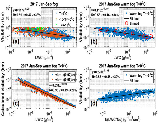 As mentioned earlier, by combining the LWC and measured using the FM-120 and visibility obtained from the PWD22, a regression equation similar to Equation (8) can be derived. Figure 15 shows the scatterplots of visibility against LWC for different temperatures (Figure 15a), for warm fogs with binned data in red circles (Figure 15b), the same as Figure 15b but based on calculated visibility (Figure 15c), and, for warm fogs, the observed visibility is plotted against the inverse of the product of LWC and (Figure 15d). The parameterization equation with correlation coefficient R, standard deviation σ and relative error ε are shown in each panel. The best-fit lines for each panel are also shown in the figure. The binned data in red circles represent the mean value of LWC; visibility in each bin is matched with the fit line in Figure 15b. The regression relationships of observed visibility versus LWC for all temperatures and for warm fog events (T ≥ 0 °C) are given in Equations (11) and (12), respectively. For warm fogs, the regression relationship of calculated visibility versus LWC is given in Equation (13), and the relationship between observed visibility and both LWC and Nd is given in Equation (14).