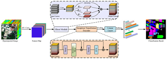 In this section, we will focus on describing the structure and details of the IFormer, as shown in Figure 1 and Algorithm 1, by describing how to extract high- and low-frequency information from the HSI, so that the HSI features can be classified at a fine-grained level. The network structure consists of two main components: the Ghost Module processes the spectral features to generate more feature maps, and then the Inception Transformer can effectively learn from the feature maps to a combined feature containing both high- and low-frequency information from the ground. We elaborate on both parts in the following subsections.