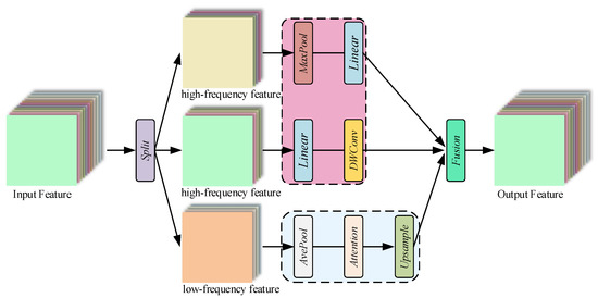 High-frequency mixer: Since the maximum filter is sensitive to features and the convolution operation is equally detail-aware, we use a parallel structure for detailed features to learn the high-frequency components, (i.e., local features and boundaries). We divided the high-frequency component Y h , in the channel dimension into Y h 1 R s × s × n h 2 and Y h 2 R s × s × n l 2 . For the high-frequency mixer, Y h 1 is fed into a max-pooling and a linear layer, and Y h 2 is embedded in a linear layer and a deep convolution layer, as presented in Figure 2.