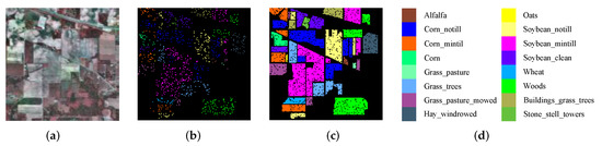 The Indian Pines dataset was collected using an Airborne Visible/Infrared Imaging Spectrometer (AVIRIS) sensor in Northwestern Indiana, USA. The 24 absorbing bands are removed, so that the next 200 bands are retained out of 224 spectral bands. The dataset has a spatial size of 145 × 145 pixels, a spatial resolution of 20 m/pixel, a spectral resolution of 400–2500 nm, and a labeled pixels count of 10,249, covering 16 object categories. The composite images, training set, test set, and legend are presented in Figure 3, and the number of training samples, the number of validation sets, and the number of test sets for the corresponding categories are provided in Table 1.