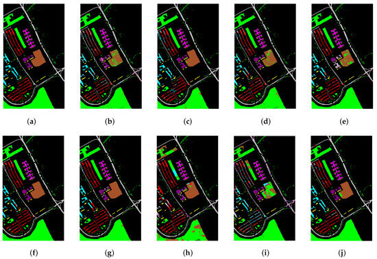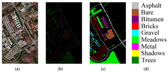 The University of Pavia dataset was collected by the ROSIS-03 sensor at University of Pavia, Italy, in 2002, measuring 610 × 340 pixels with a spatial resolution of approximately 1.3 m. The dataset contains nine main landcover classes in the wavelengths range of 0.43∽0.86 μ m, with a total of 42,776 labeled pixels, in addition to the background. The original dataset had 115 bands, and after removing 12 high-noise bands, the remaining 103 bands were selected for the experiment. Figure 4 and Table 2 give detailed information on the UP dataset.