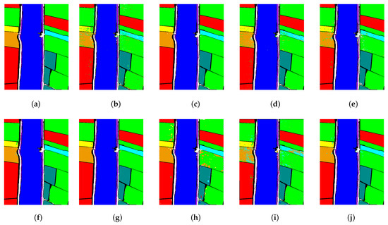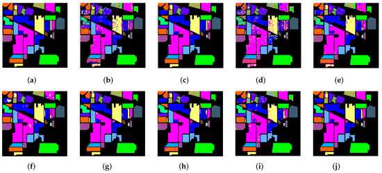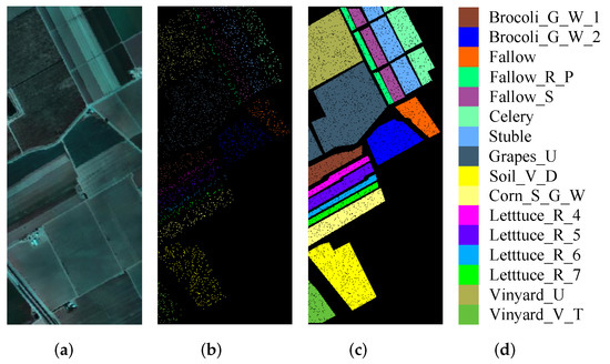 The dataset scene has a spatial resolution of 3.7 m/pixel and was acquired using AVIRIS sensor photography in Salinas Valley, California. Additionally, the scene consists of 512 × 217 pixels, and after removing 20 water vapor bands, 204 water vapor bands remain. The SV dataset contains 16 classes and 54,149 pixels as ground truth. Figure 5 shows the composition map, training label map, test label map, ground truth, and legend of the SV dataset. The training set, validation set, and test set are picked according to the description in Table 3.