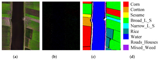 The WHU-Hi-LongKou dataset was photographed using an 8 mm focal length hyperspectral imager in the LongKou town area of Hubei Province, China [50,51]. The spatial resolution of the airborne hyperspectral images is approximately 0.463 m. The dataset is 550 × 400 pixels in size and has 270 bands, located between 400∼1000 nm. The research scenario focuses on crop areas, with nine landcover types such as corn, cotton, and sesame. The main falsecolor image of the LK dataset, the training sample set, the test set, and the reference color code are shown in Figure 6. For the experiment, 1% of datasets was used for each of training and validation, and 98% was used as the test set, as shown in Table 4.