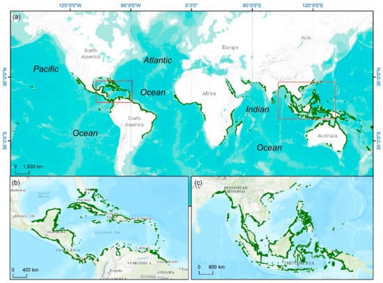 The biophysical variables of mangroves (i.e., leaf area, basal area, tree height, percent canopy closure, diameter at breast height, carbon stock, and biomass) mostly depend on climatic conditions, while sea level rise has an influence on the structure and spatial distribution of mangroves [7,8]. Temperature, precipitation, and storminess explain 74% of the global trends in the maximum values of canopy height and above-ground biomass [7]. Globally, 75% of mangroves are distributed in tropical regions. The largest cover and highest mangrove diversity are found in Asia (39%), followed by Africa (21%, but mostly on the eastern side), North and Central America (15%), South America (12.6%) and Oceania (Australia, Papua New Guinea, New Zealand, south Pacific islands) (12.4%) [9,10]. The mangroves in the equatorial regions have the maximum biomass and tree canopies can reach an average height of 30–40 m. The highest mangrove forests are found in Gabon, an equatorial African nation, where heights reach 62.8 m. A quarter of the estimated 11.7 Pg C global mangrove carbon stock, which includes soil, above- and below-ground biomass, is stored in Indonesia [7,8]. These biophysical parameters gradually decrease with increasing latitude due to varied temperature and environmental conditions.