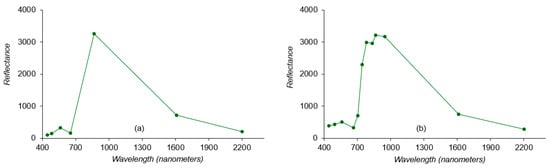 Spectral signatures of mangroves (Rhizophora) in Can Gio Mangrove Biosphere Reserve, Vietnam, derived from median values of (a) Landsat 8 and (b) Sentinel-2A surface reflectance in February 2021 (Source: obtained from Google Earth Engine).