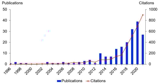 Change in 195 peer-reviewed publications and their citations per year between 1996 and 2021 (based on the citation report tool in TDA using mentioned keywords).