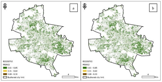 - Fabijańczyk, P.; Zawadzki, J. Spatial Correlations of NDVI and MSAVI2 Indices of Green and Forested Areas of Urban Agglomeration, Case Study Warsaw, Poland. Remote Sens. Appl. Soc. Environ. 2022, 26, 100721. [Google Scholar] [CrossRef]