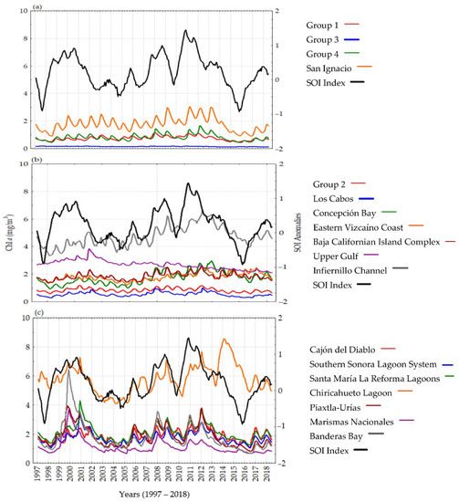 The Chl a concentration anomalies varied from −1.24 to 2.06 units (Figure 5), showing the highest range at the Upper Gulf, Marismas Nacionales, and San Ignacio, whereas the regions with the smallest range levels were Baja California Island Complex (−0.72 to 1.01); Piaxtla-Urías (−0.64 to 1.11); and Group 2 (−0.80 to 0.99) units. The time series and the time series anomalies graphs of each region were compared with SOI Anomalies which showed a range from −0.93 to 1.45 units of anomalies, which indicates the presence of positive values associated with La Niña Events and negative ones linked to El Niño Events. These results explain that Chl a concentration shows an effect of interannual events, derived from the presence of warm waters (El Niño) and cold waters (La Niña). In addition, during the analyses of the time series anomalies, a delayed response of Chl a values was observed, regarding SOI database during the periods 1997–1998 (very strong), 2009–2010 (moderate) and 2015–2016 (very strong), corresponding to El Niño events; whereas, the delayed response is linked to La Niña events with different intensity levels during the periods 1998–1999 (strong), 1999–2000 (strong), 2000–2001 (weak), and 2007–2008 (strong).