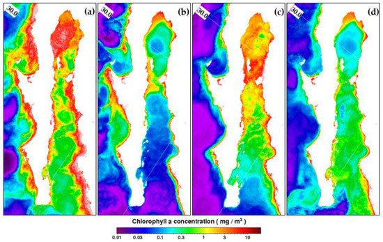 In this sense, using satellite remote sensing is useful to measure Chl a concentration, which allows characterizing oceanographic conditions and variability [18]. Additionally, physical and biological aspects of the ocean are described at different spatiotemporal scales [19,20] through constant availability of data in time and space. Satellite measurements of ocean color provide a large scale and wide coverage sampling of global chlorophyll, which help us to understand the phytoplankton’s role in biochemical cycling, its variability due to climate change, and its effects on the ecosystem and some fisheries [21,22].