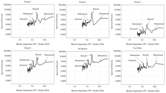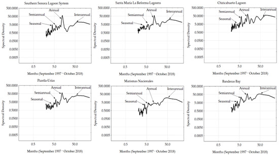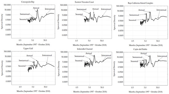 The Fourier analyses showed a total of four frequencies of variation (Figure 7, Figure 8 and Figure 9). The results indicated that the annual frequency is the most important, followed by the semi-annual one associated with six-month periods—seasonal frequency that determines the 3–4-month periods—and the interannual, whose 3–5-year periods are associated with ENSO climate events. In some of the regions, the semi-annual frequency had a similar spectral density as the annual one, such as the Upper Gulf. Other regions (Concepción Bay, Cajón del Diablo and Southern Sonora Lagoon) obtained equal levels of seasonal spectral density with the semi-annual frequency, whereas the Eastern Vizcaíno Coast showed a higher semi-annual frequency than the annual one. Seasonal frequency was higher than the semi-annual in Group 2. On the other hand, interannual frequency was significant in Marismas Nacionales and Banderas Bay, where this frequency was one of the most important in Chl a variability during the period of study.