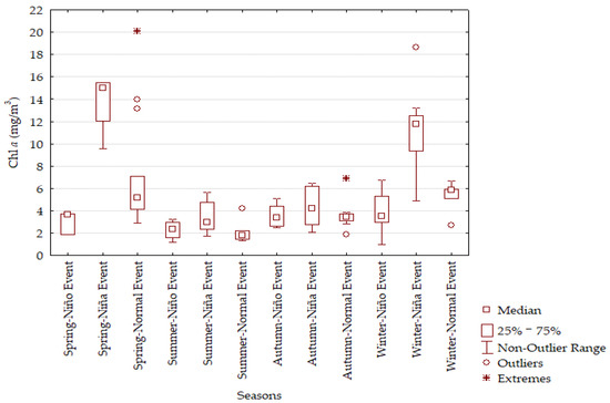 Box-whisker plots for monthly Chlorophyll a (Chl a) concentrations in different seasons during the interannual events for Piaxtla-Urías region of the Northwest of Mexico.