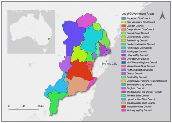 Eastern parts of Australia including Southern Queensland and New South Wales have long been known as areas that are exposed to extreme flood events [29]. In this study, FV to pluvial and fluvial flooding is assessed, meaning that an area that is removed from potential coastal flood events was preferable as a study area. Over the past years, the HNC area located in Greater Western Sydney (GWS) has been subjected to heavy precipitation events that have led to several floods [30]. The region stretches over 21,000 km2 from south of Goulburn to north of the Putty Valley, and from west of Lithgow to the coast. The catchment contains 26 LGAs (Figure 1) and 11 main rivers (Figure 2).