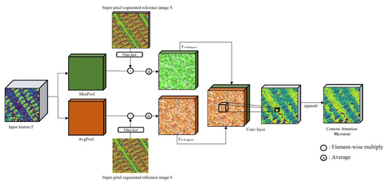where represents the original image feature and represents the super-pixel segmented post-temporal image. Firstly, we compute the max pooling and avg pooling of the original features separately. Meanwhile, the one-hot processed super-pixel segmentation image is produced and multiplied with the pooled feature to obtain . The number of segmented objects is , and is the total number of pixels. Calculated contains the original feature information and the index information of the super-pixel segmented objects. Then, we calculated the to describe the average of the original feature in super-pixel segmented objects. Furthermore, we multiply with the one-hot processed super-pixel segmentation image to generate the new feature . Finally, we concatenate two new features generated by averaging and pooling features to obtain more channels to feature. Meanwhile, a Conv operation with the kernel size of 7 × 7 and a nonlinear operation are adopted to obtain the final contour attention map ().