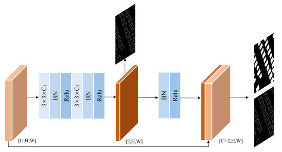 As shown in Figure 6, we combine our module’s edge estimation task and building change prediction task to achieve a mutually reinforcing effect. Firstly, we use the Conv block, which includes a convolution kernel with the size of 3 × 3, BN and Relu to extract edge information. The represents the channel number of the original feature and is set to 2. After the above operation, we obtain the edge information from the output. Then, we adopt the BN and Relu to further obtain nonlinear boundary information. Finally, original features are concatenated with edge information to estimate the binary change and edge prediction maps. The advantage of the EA module is that the edge feature can be integrated directly into the discriminant feature, thus improving the accuracy of detecting building changes and alleviating the mixing and misclassification of building edges.